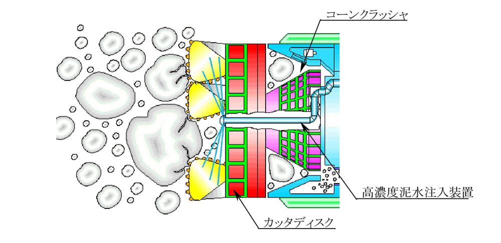 掘削した土砂は高濃度泥水と撹拌混合して流動化させ、掘進機内の排土バルブを開閉することで、切羽を安定させながら間欠的に排土します。大気圧下に排土された堀削土砂は、搬送可能な大きさに選別し、真空吸引により搬出します。