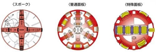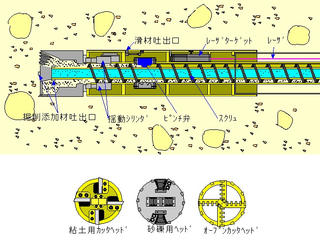 スクリューコンベアーによって掘削量に見合った排土を行うことで、切羽土圧を調整します。また、先導体の先端カッターを交換することにより、粘性土・普通土・礫・玉石地盤と対応する事ができます。