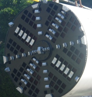 泥濃式推進工法は、掘進機前面のカッター後方に隔壁を設け、切羽と隔壁の間のカッターチャンバー内に高濃度の泥水を圧送充満し、切羽の安定を図りながら、カッターの回転により掘削し、立坑に設置した元押しジャッキ等により推進を行います。