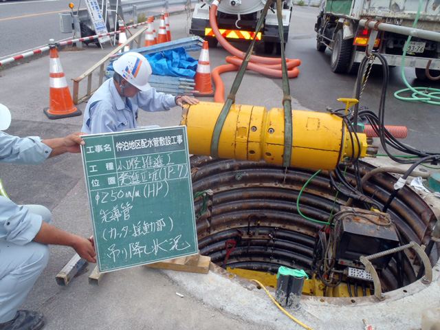 私たちが手がける工事は、非開削工法で、開削工法に比べ路面を掘削することが少なくなるため、交通渋滞の緩和や、騒音、振動、粉じん等、工事公害の低減に優れ、市民生活へ配慮しています。特に、交通量の多い道路や市街地などを横断して開削が困難な箇所での工事で特徴を発揮します。