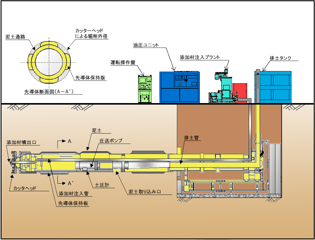 泥土圧式推進工法は、推進管の先端に泥土圧式先導体を装備し、遠隔操作による高度な方向修正が可能な推進工法です。 掘削土に流動性を持たせ、切羽の安定を図るために掘削添加剤を注入し、カッターにより掘削された土砂を添加剤と混合して泥土に改良します。 改良された泥土は先導体外周の泥土通路を通り、土砂圧送ポンプにより立坑外の排土タンクまで圧送排土されます。 作泥材の選択と排土量の管理により、粘性土・砂質土・砂礫土・玉石混じり等の広範囲な土質条件への対応が可能な推進工法です。