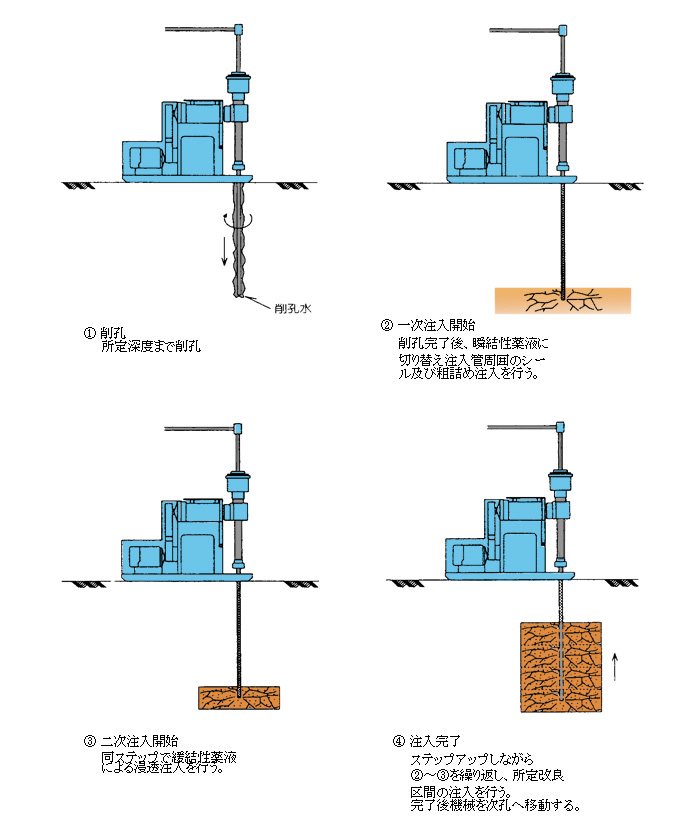 二重管ボーリングロッドをそのまま注入管として使用し、主に瞬結型注入材を用いて止水、および地盤強化を目的として行います。