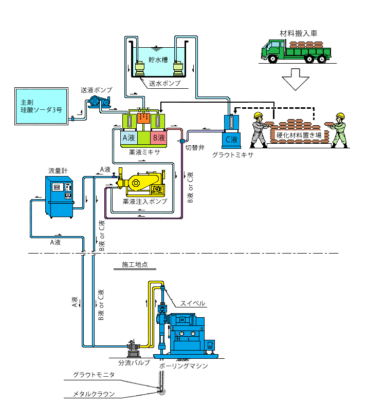 薬液注入は、地盤の透水性の減少または、地盤の強度を増加させることから、地下管路工事などの土木建築工事の掘削等の安全を図る補助工法として用いられています。