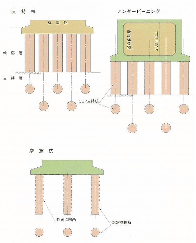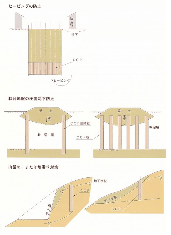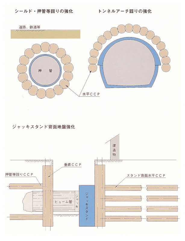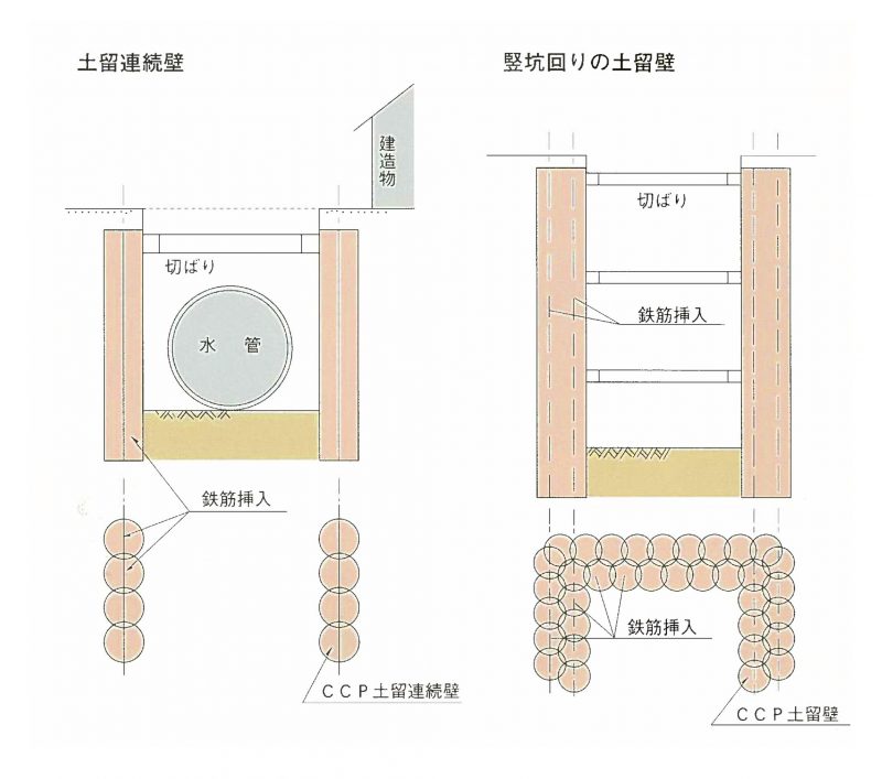 - CCP-P工法(有効径φ300~φ500) CCP-L,LE工法(有効径φ500~φ1000) CCP-S,SE工法 (有効径φ800~φ1,500)