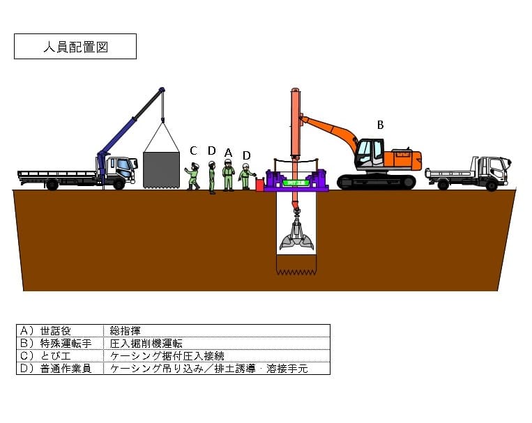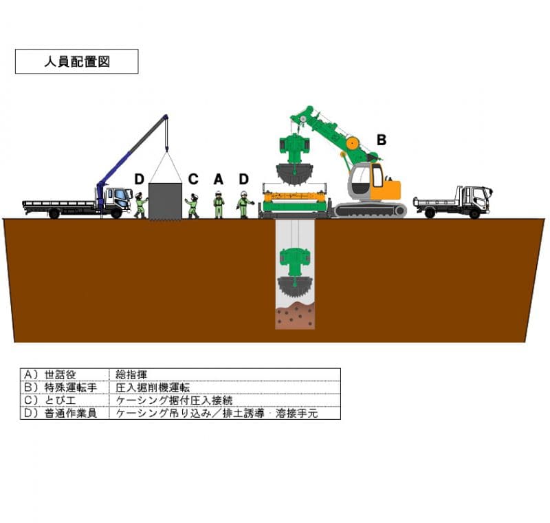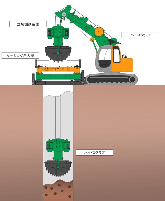 - 地下水位以下の掘削および序盤が軟弱な場合は水中掘削で対応します。