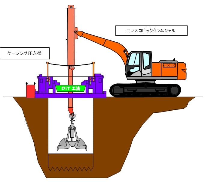 PIT工法は、ケーシングを揺動させ地中に圧入して内部を掘削し、規定の深さまで下げた後、底盤コンクリートを打設して水替え後立坑として構築するものす。